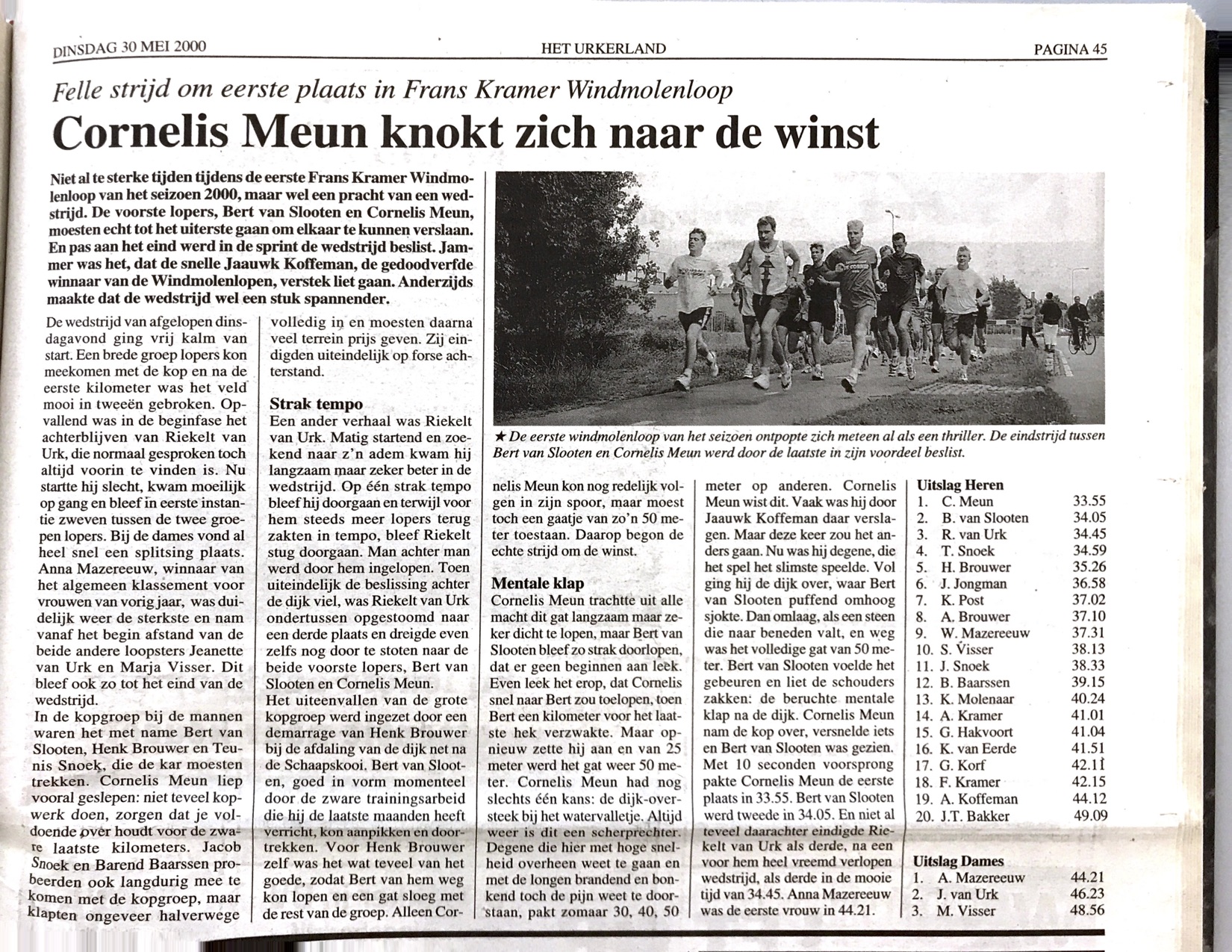 Home Windmolenloop Cornelis Meun knokt zich naar de winstCornelis Meun knokt zich naar de winst30 mei 2000Windmolenloop Vorige Bericht Cornelis Meun knokt zich naar de winst - mei 2000 Volgende Bericht Frans Kramer-Windmolenloop van start