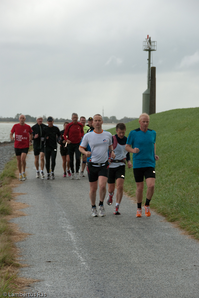 Het was afgelopen zaterdag een loop om in te lijsten. Alles wat lopen achter de dijk zo mooi maakt was aanwezig. Wind, regen en zon wisselden elkaar namelijk af. Voor de lopers was het voortdurend anticiperen op deze omstandigheden. Toch ging dat iedereen prima af en konden de meesten een persoonlijke toptijd noteren. Met name omdat de wind na de “Rotterdammer-hoek” de lopers in de rug blies. 26 heren en 6 dames waren aan de start verschenen.