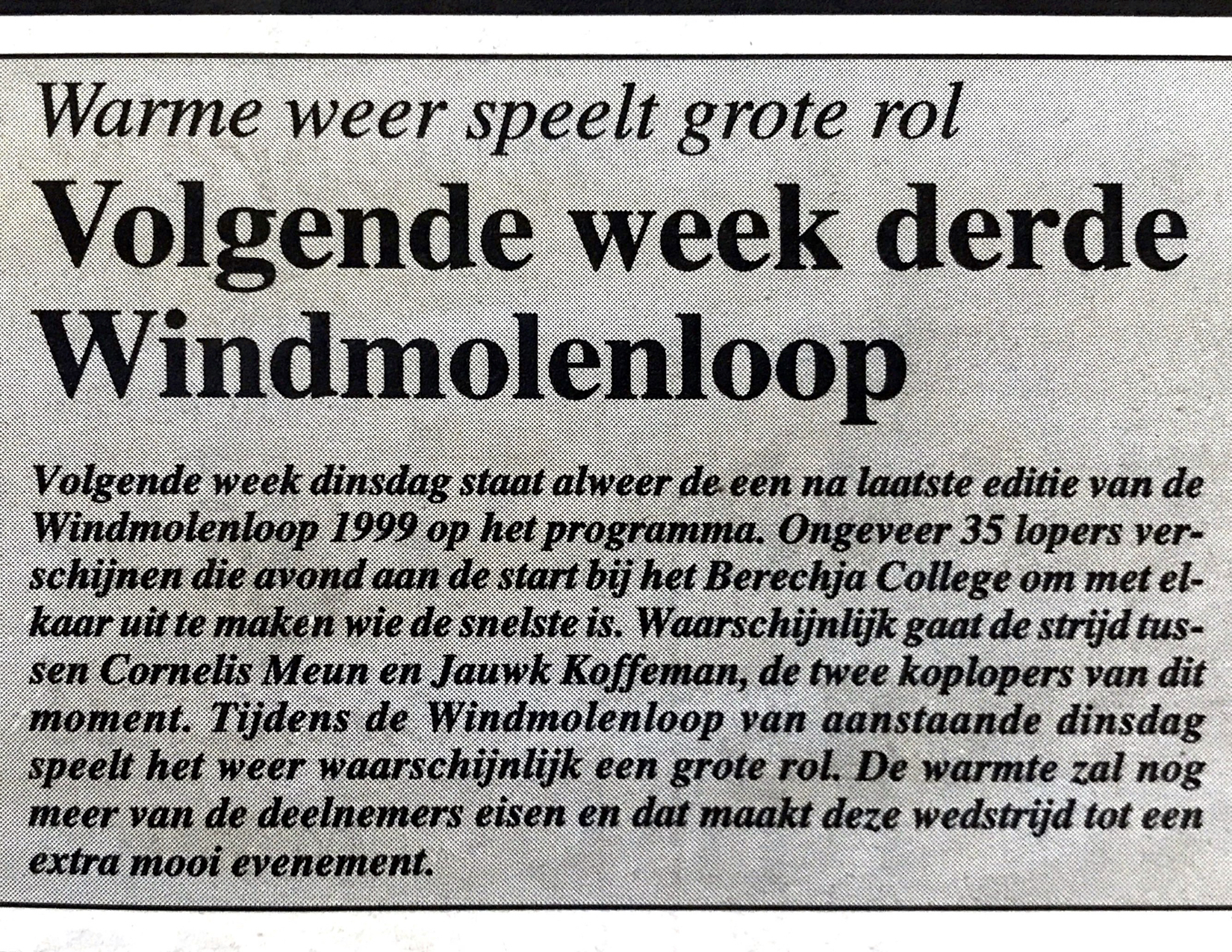 Home Windmolenloop Volgende week derde windmolenloopVolgende week derde windmolenloop15 juli 1999Windmolenloop Vorige Bericht Wie verslaat Jaauwk? Volgende Bericht Matige tijden tijdens derde Frans Kramer/Windmolenloop